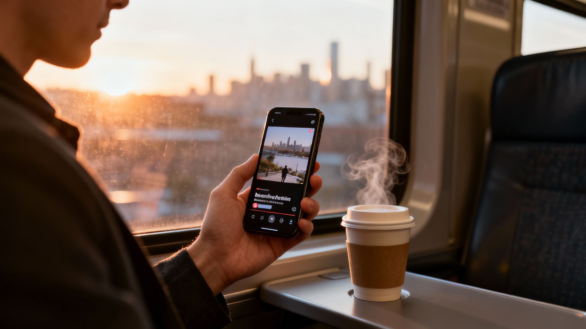 Person on a train holds a phone displaying a city skyline, with a steaming coffee cup and sunset.
