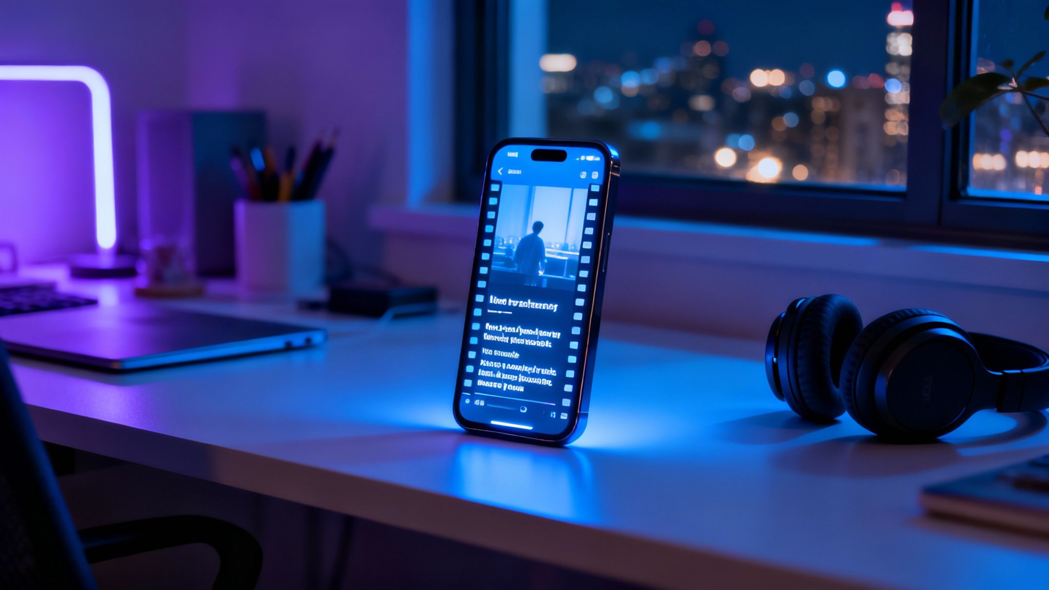 Modern desk setup at night with a smartphone playing video, headphones, and laptop, illuminated by blue and purple light.