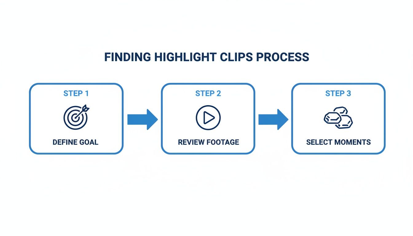 A three-step process diagram illustrating how to find highlight clips: Define Goal, Review Footage, Select Moments.