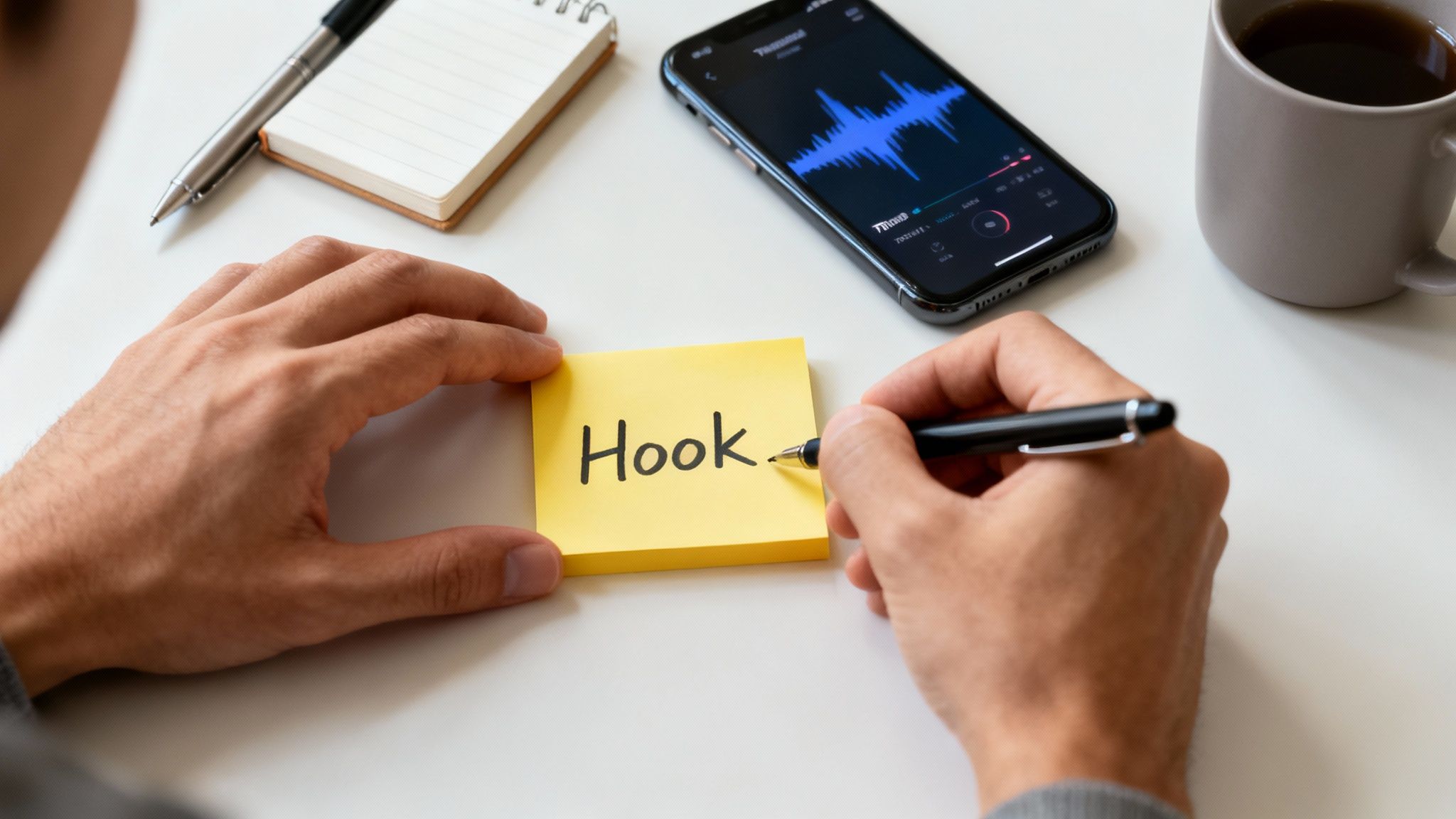 A person's hands writing 'Hook' on a yellow sticky note, brainstorming content next to a smartphone.