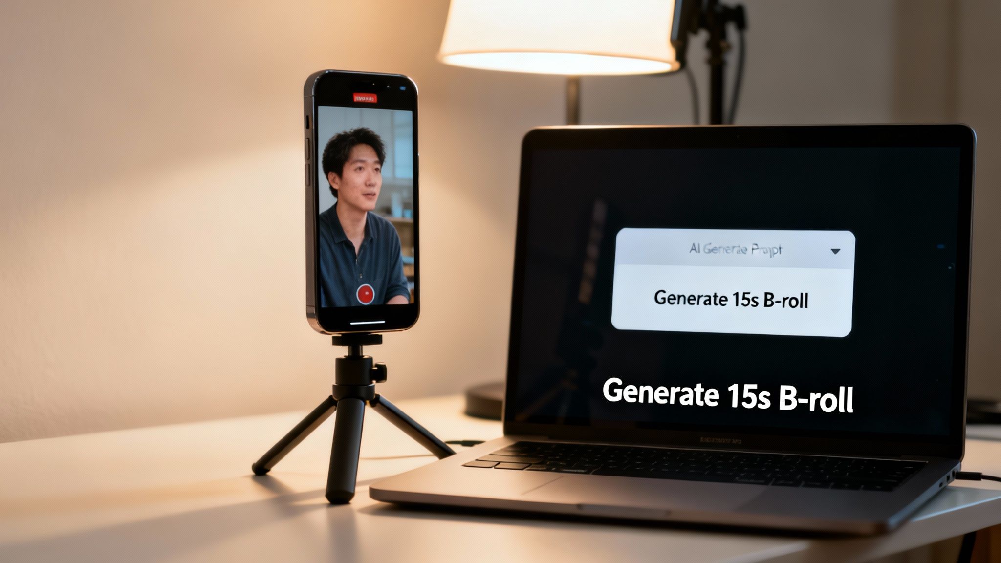 A smartphone on a tripod records a man, next to a laptop displaying an AI prompt for generating 15-second B-roll video.