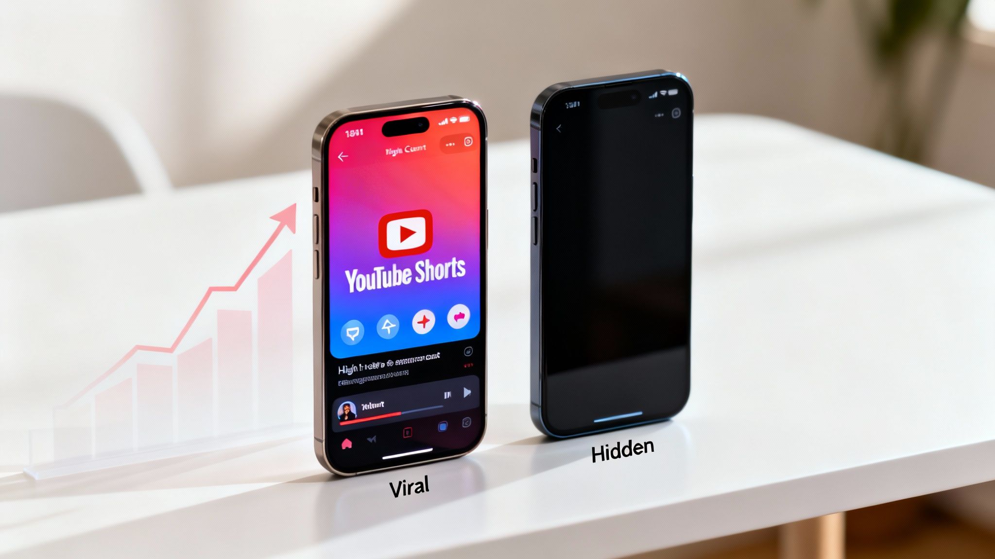 A phone displaying viral YouTube Shorts content, contrasted with a hidden black-screen phone, symbolizing visibility.